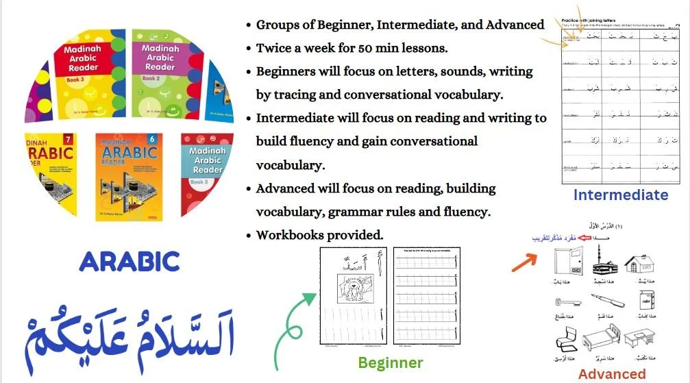 Our Arabic classes are interactive and taught by highly qualified educators. Students will receive uniquely designed workbooks that are geared to build articulation, recognition and mastery of the Arabic language.